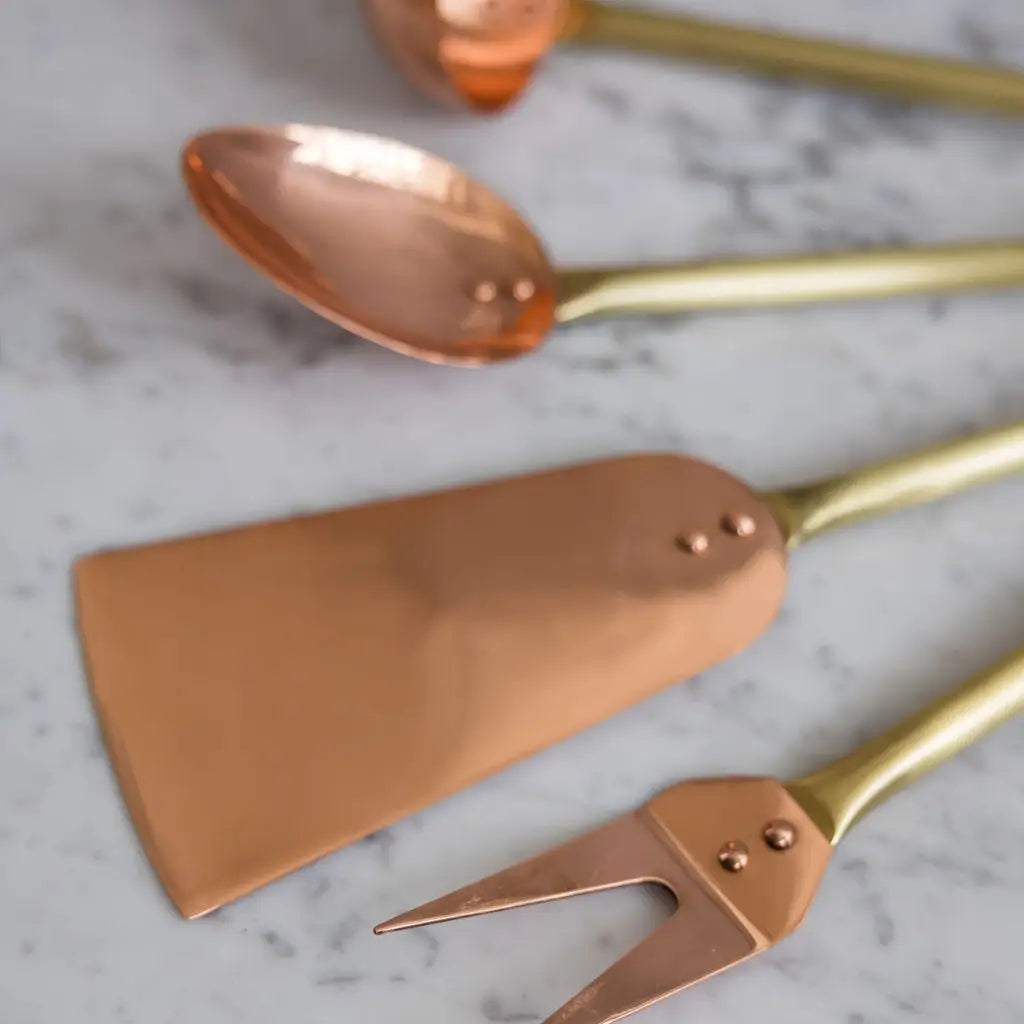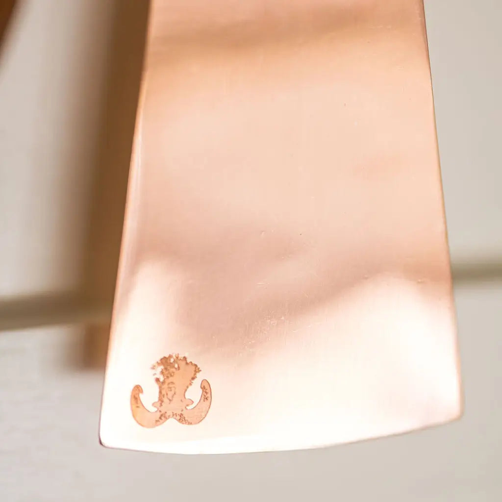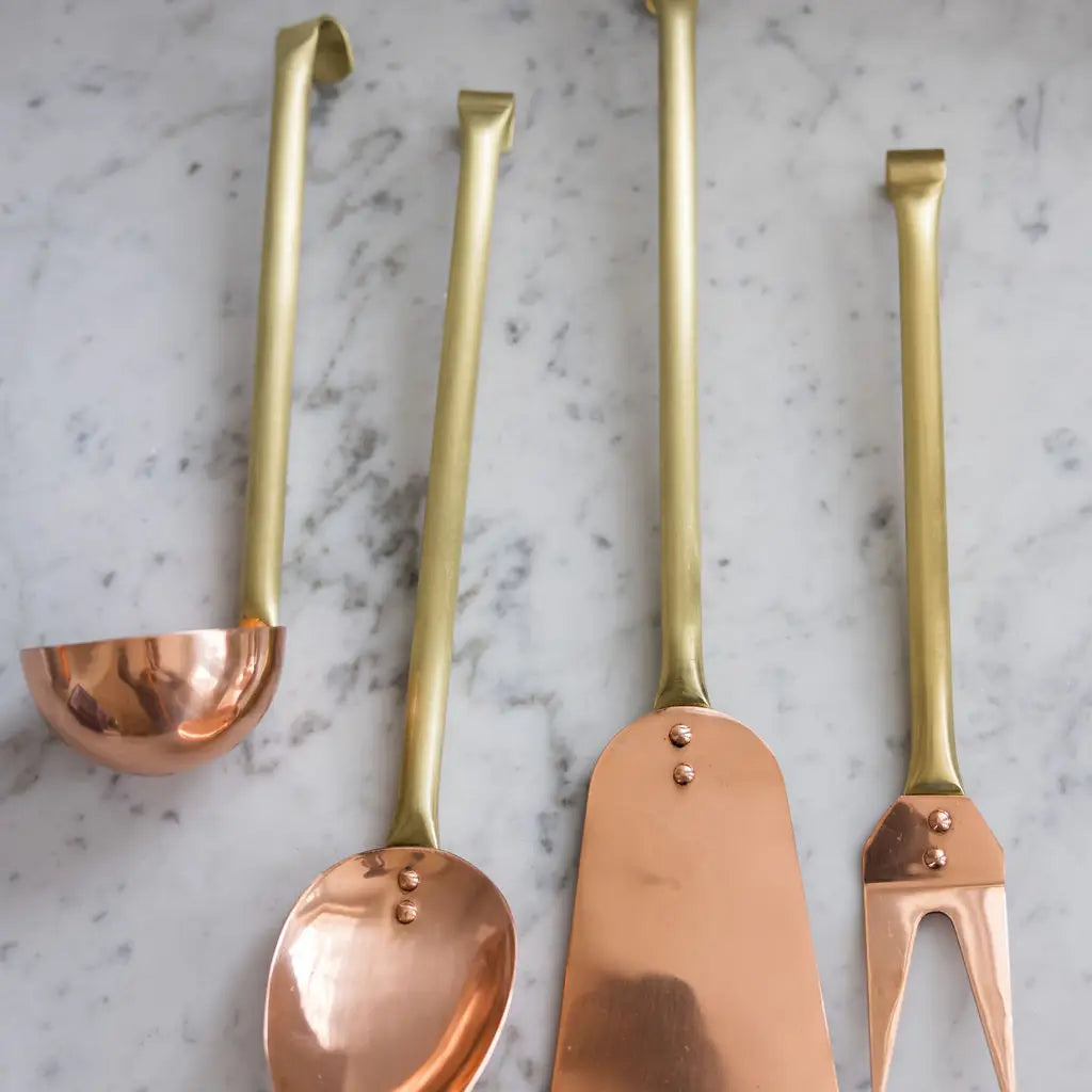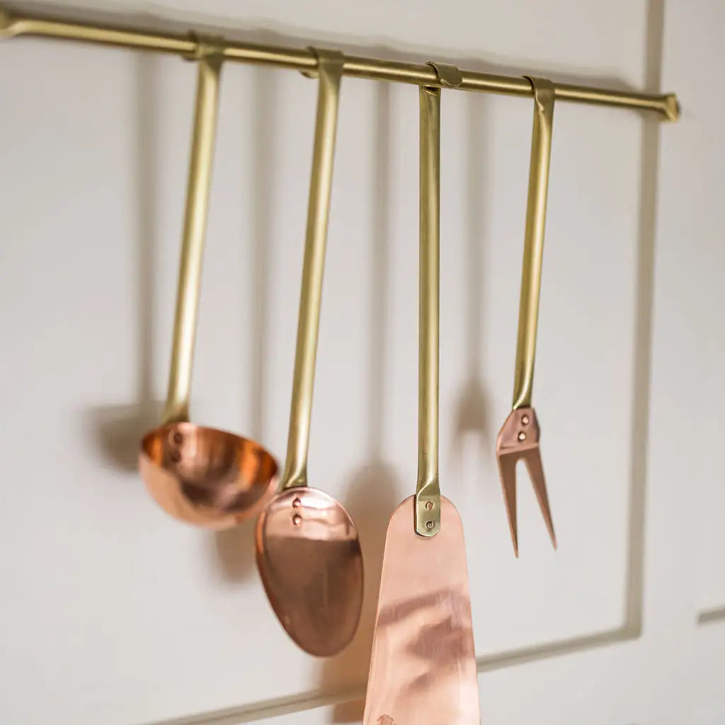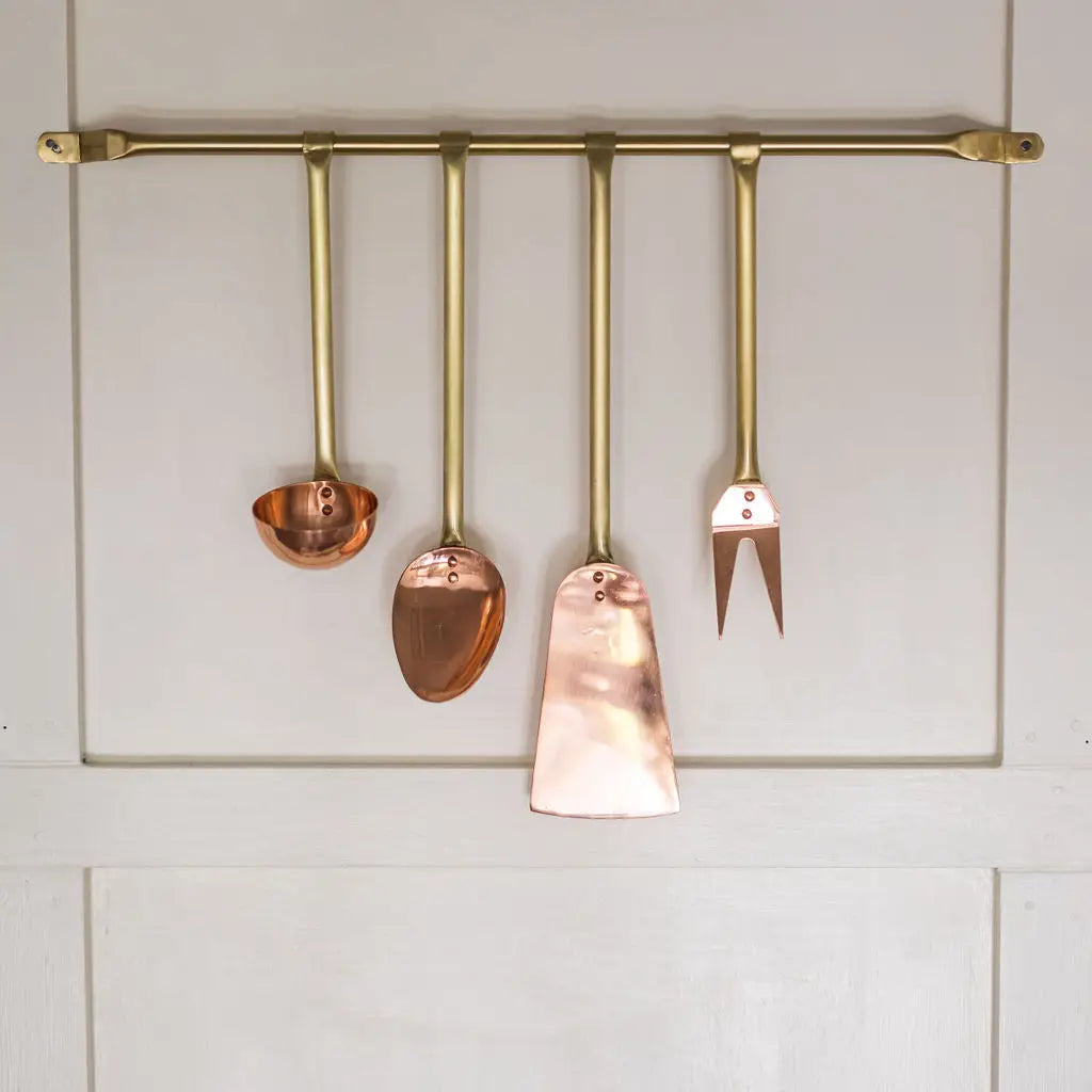 100% brass rod features two holes on either end for hanging. Included with the rod are four hanging utensils, made from 100% copper and brass.