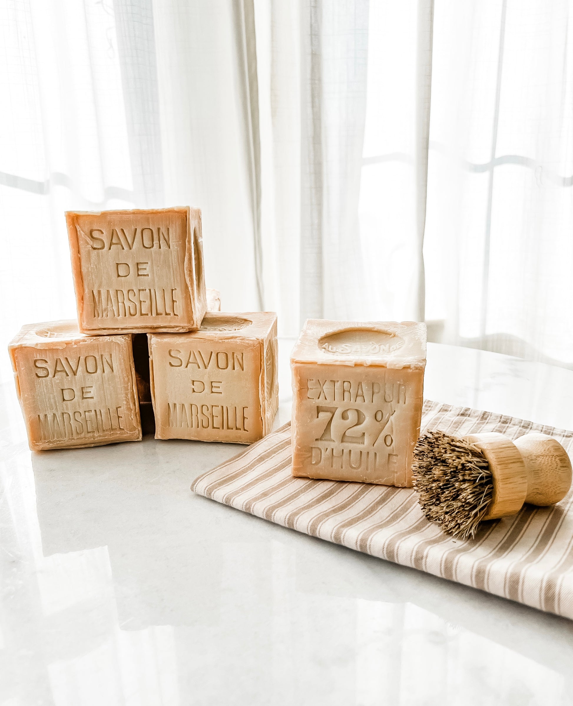 Genuine Savon de Marseille (Marseille soaps). Imported. Made in Marseille, France. This household soap works well with a bamboo dish brush to sustainably clean your dishes, pots and pans. Clean counters and surfaces by rubbing a wet towel and apply. With its refined rustic look, this soap looks more like beautiful home decor than cleaning supply! Beauty & function!