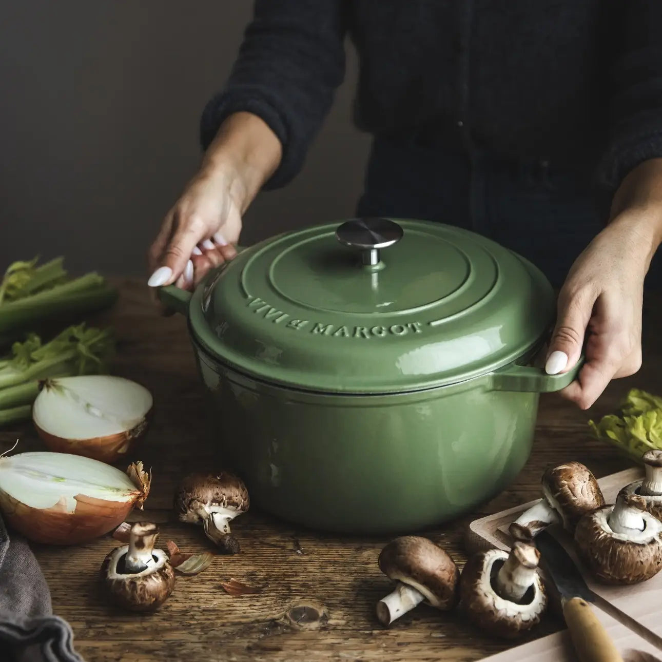 Crafted from durable cast iron, this enameled round dutch oven is a versatile and timeless addition to your kitchen. With a generous 5.7 quart capacity and included lid, it's perfect for slow-cooking stews, casseroles, and roasts. The signature green finish adds a touch of French charm to any home, and at 6.5 kilos, it's built to last for years to come.